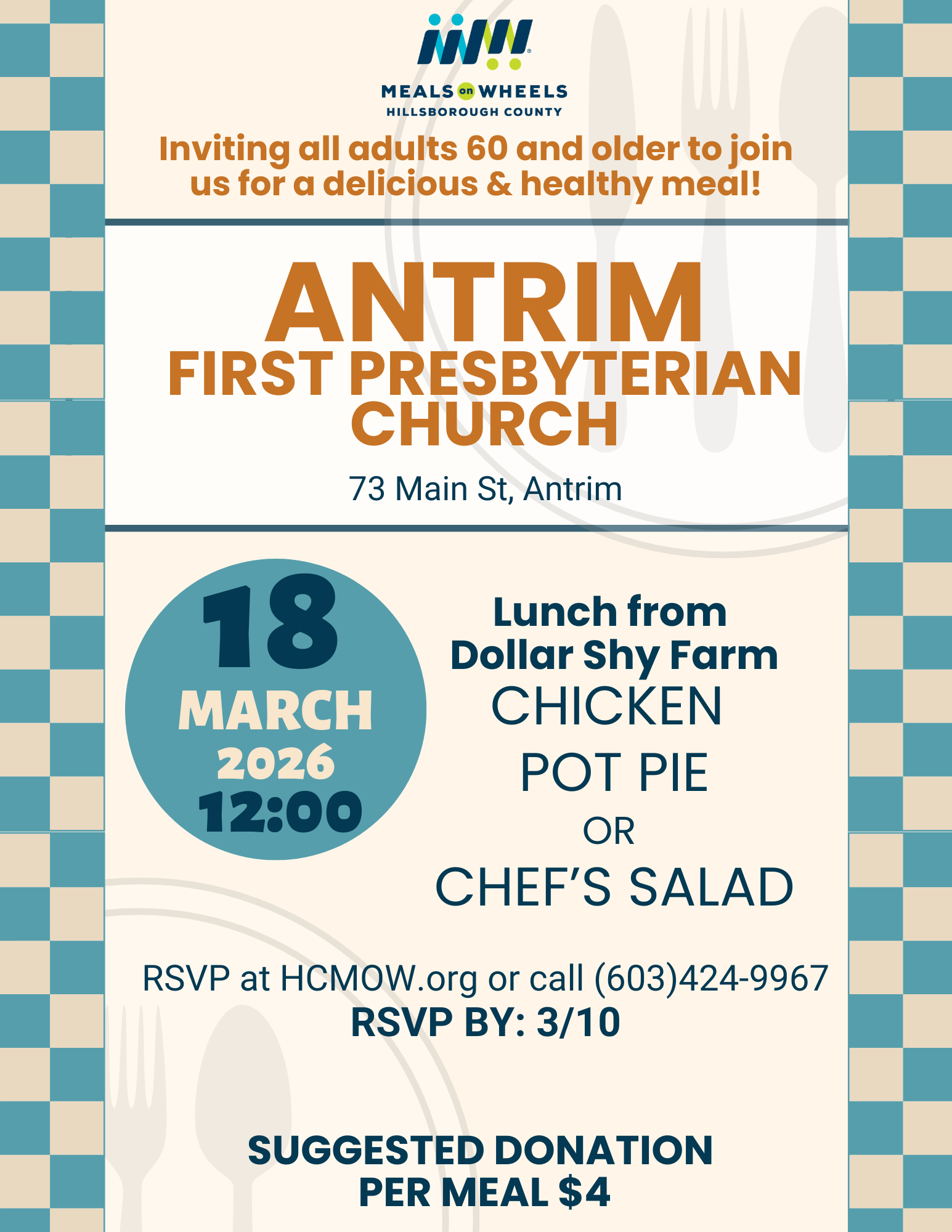 $4 per mealYour contribution helps us continue to provide healthy meals and friendly connections for older adults in our community.