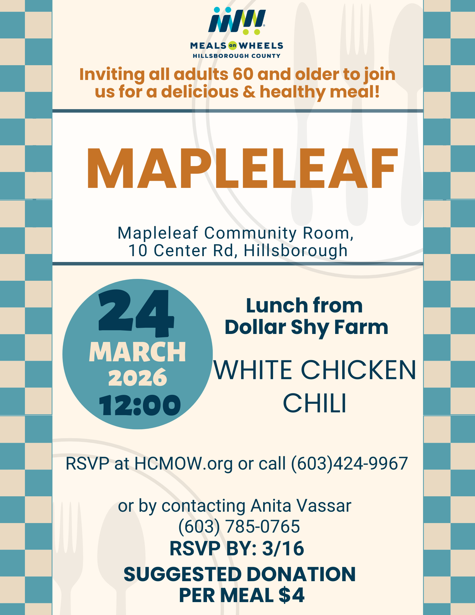 Location: Mapleleaf Community Room, 10 Center Rd, HillsboroughDate: Every fourth Tuesday of the monthLunch Served: 12:00 PM